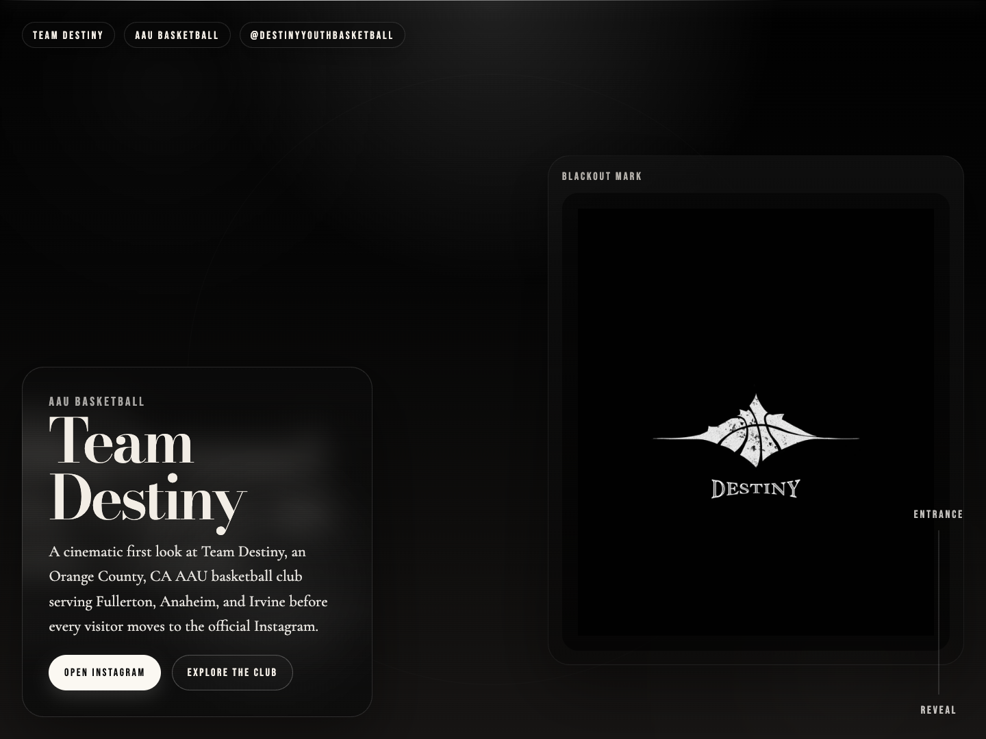 The site is intentionally narrow in scope. Instead of trying to be a full program portal, it behaves like a polished first impression: black tunnel entrance, ivory court reveal, and two logo treatments that frame Team Destiny as a serious club from the first scroll.